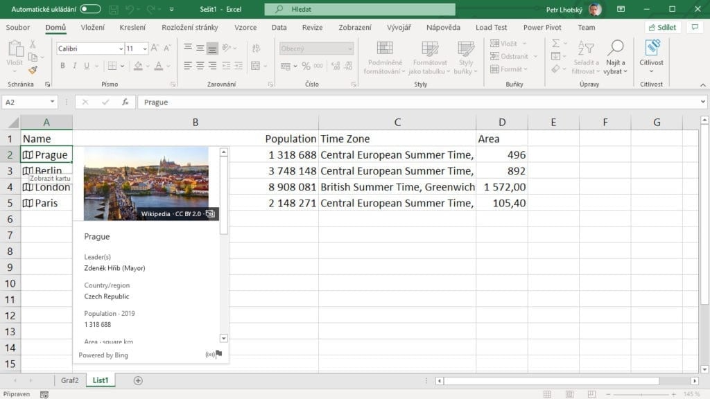 V tuto chvíli se nacházíme ve stejné situaci jako u akcií a podobně budeme i pokračovat. Po kliknutí na ikonku mapy vedle názvu města se nám rozbalí plovoucí karta, která obsahuje všechny podstatné informace o vybraném městu spolu s fotografiemi a popiskem z Wikipedie. A po kliknutí na tlačítko Vložit data u buňky s městem si i zde můžeme vybrat nejrůznější funkce, jako jsou třeba počet obyvatel, rozloha, stát, časová zóna a mnoho dalších.