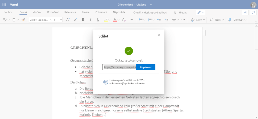 - Dále můžete stisknout tlačítko Kopírovat odkaz. Poté se vám zobrazí oznámení, že odkaz na váš dokument se zkopíroval. Odkaz můžete poslat například do třídního týmu v Teams, kde si vaši spolužáci jednoduše odkaz rozkliknou.