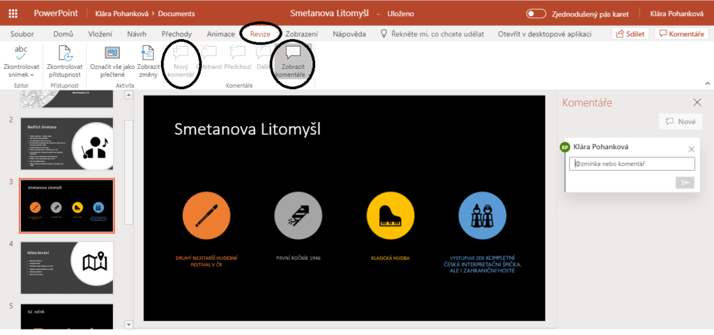 Jako první vytvořte dokument, který následně můžete sdílet s ostatními členy projektu. Nezapomeňte nastavit, aby mohli s dokumentem pracovat. Pokud jste připojeni k internetu, můžete pracovat všichni najednou. Až si budete prezentaci navzájem kontrolovat, bude se vám hodit funkce Komentář. V kartě Revize najdete funkci Nový komentář. Díky této funkci můžete dokument komentovat a označovat ostatní. Pokud si chcete zobrazit komentáře ostatních, zvolte funkci Zobrazit komentáře.