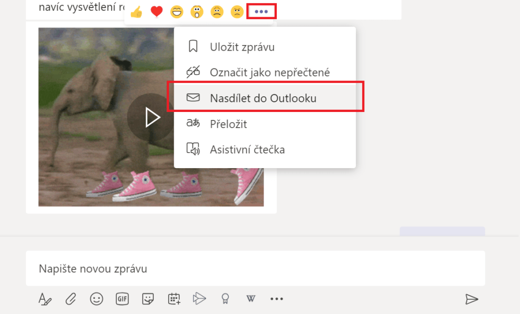 Pro zapnutí této možnosti je zapotřebí zvolit, která konverzace z týmu se má sdílet mezi Outlookem a Teams, poté u zprávy klikneme na tři tečky a tam ze seznamu vybereme Nasdílet do Outlooku. Toto je možné provést jak u konverzací v kanálech, tak v soukromých chatech. Toto přijde vhod, pokud nemůžeme neustále sledovat konverzace v Teams. Takto máme veškerou komunikaci převedenou do mailu, kde jí můžeme vidět a odpovídat na ni. Navíc je vše krásně přehledné a neztratíme se.