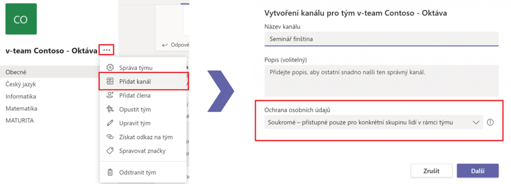 Soukromé kanály nám umožňují si v rámci jednoho týmu vytvořit uzavřený prostor, kde k jeho obsahu mohou přistupovat pouze vybraní členové týmu. Díky tomu je možnost ve větším týmu vytvářet individuální skupiny, kde sdílejí obsah pouze mezi sebou, který nemusí ostatní členové celého týmu vidět. Pro vytvoření soukromého kanálu klikneme na tři tečky, které se nacházejí vedle názvu týmu, kde následně vybereme Přidat kanál. Tím se nám otevře nabídka s možností Přidat kanál. Dole v části Ochrana osobních údajů máme dvě možnosti nastavení a to: