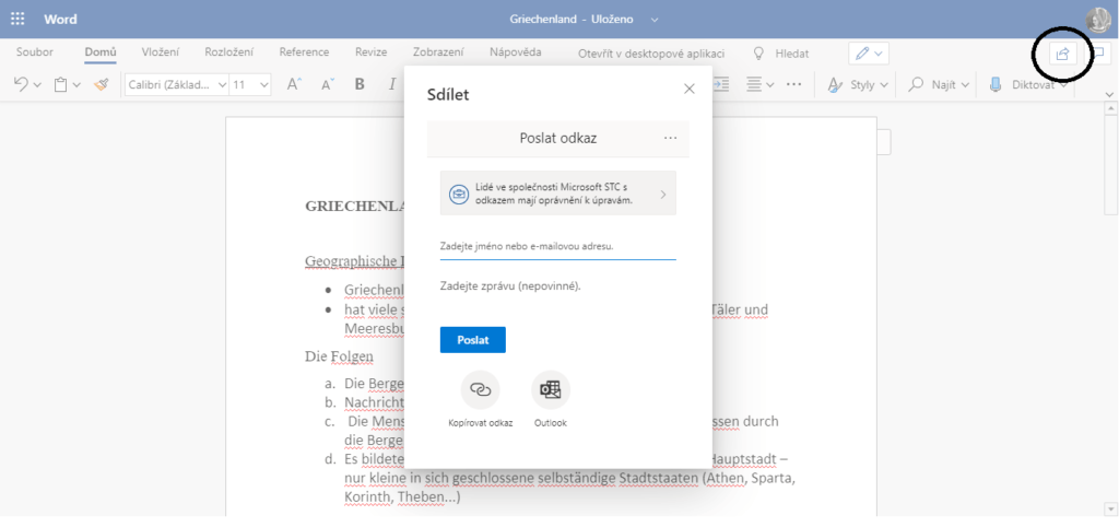 - Chcete-li dokument poslat přes e-mail z Outlooku, zvolte tlačítko Outlook, odkaz se vám otevře v něm. Pod odkazem se zobrazí nabídka, kde si můžete nastavit, jestli lidé, kterým odkaz posíláte, mohou váš dokument upravovat.