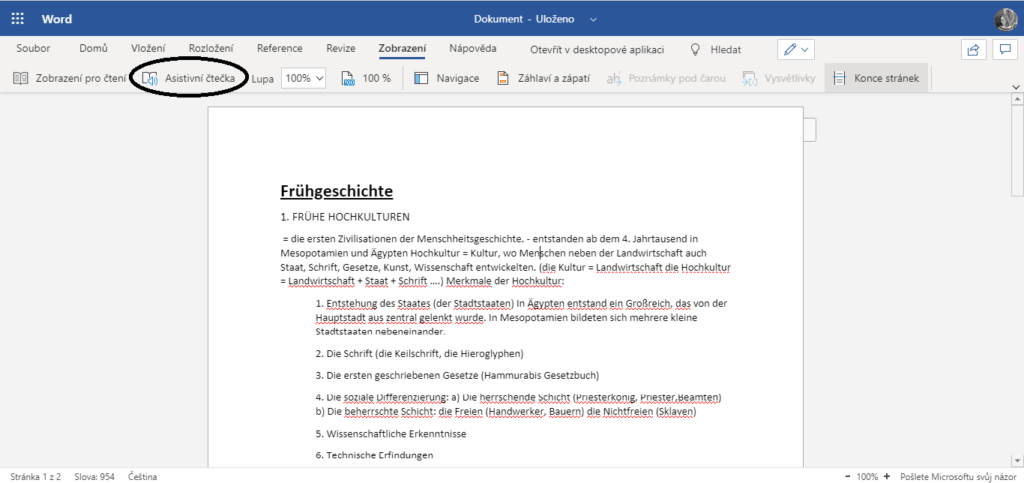 - Přejdeme na kartu Zobrazení a zde pak vybereme možnost docela novou funkci Asistivní čtečka
