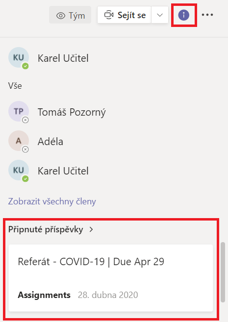 Kde se zobrazí vybrané příspěvky? Každý člen týmu se k připnutým příspěvkům dostane přes malou ikonku s písmenem „i“ v pravém horním rohu kanálu. Zobrazí se tím informace o kanálu, kde jsou mimo jiné právě i připnuté zprávy. Příspěvky je možné stejným způsobem i odepnout. Připomeneme, že možnost připnutí a odepnutí příspěvku vidí samozřejmě jen učitelé.