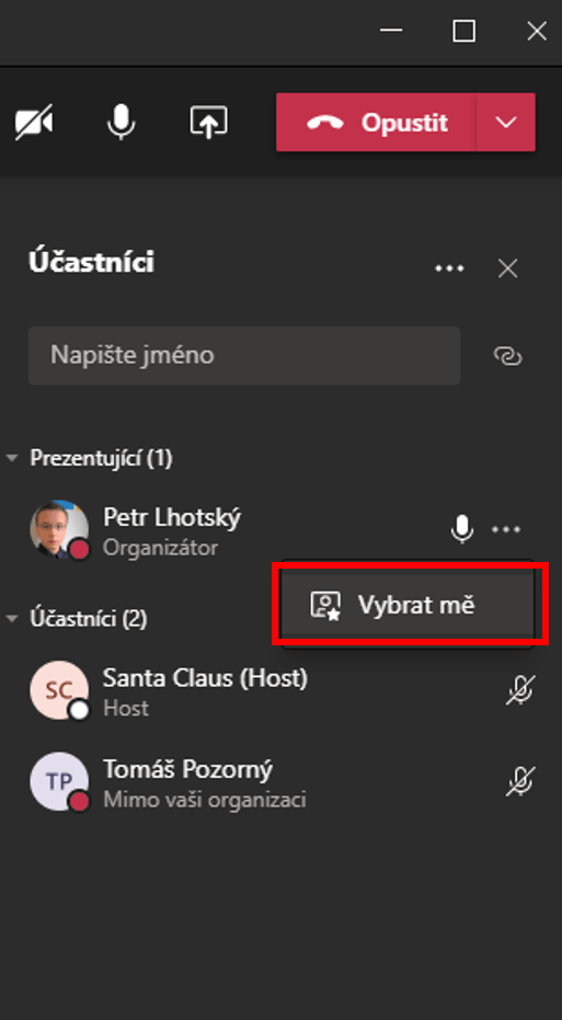 Někdy se stávalo, že studenti místo toho, aby viděli pouze učitele, který měl například připravený svůj výklad před tabulí, viděli více webkamer najednou, mezi kterými sice učitel byl také, ale v mnohém menším obdélníku, než by bylo vhodné. Každý student si tak musel ručně učitele na začátku každého hovoru připnout a kdo o funkci připnutí nevěděl, online hodina pro něj asi nebyla zrovna nejpříjemnější. Microsoft proto zapracoval i na tomto a přináší možnost Zvýraznění. Učitel jen klikne u svého jména pod třemi tečkami na možnost Vybrat mě a tím má jistotu, že je u všech studentů přes celou obrazovku pouze a jen jeho nebo její webkamera. Nastavit, kdo je právě zvýrazněný, mohou pochopitelně pouze prezentující. Nyní už každý uvidí to nejdůležitější.