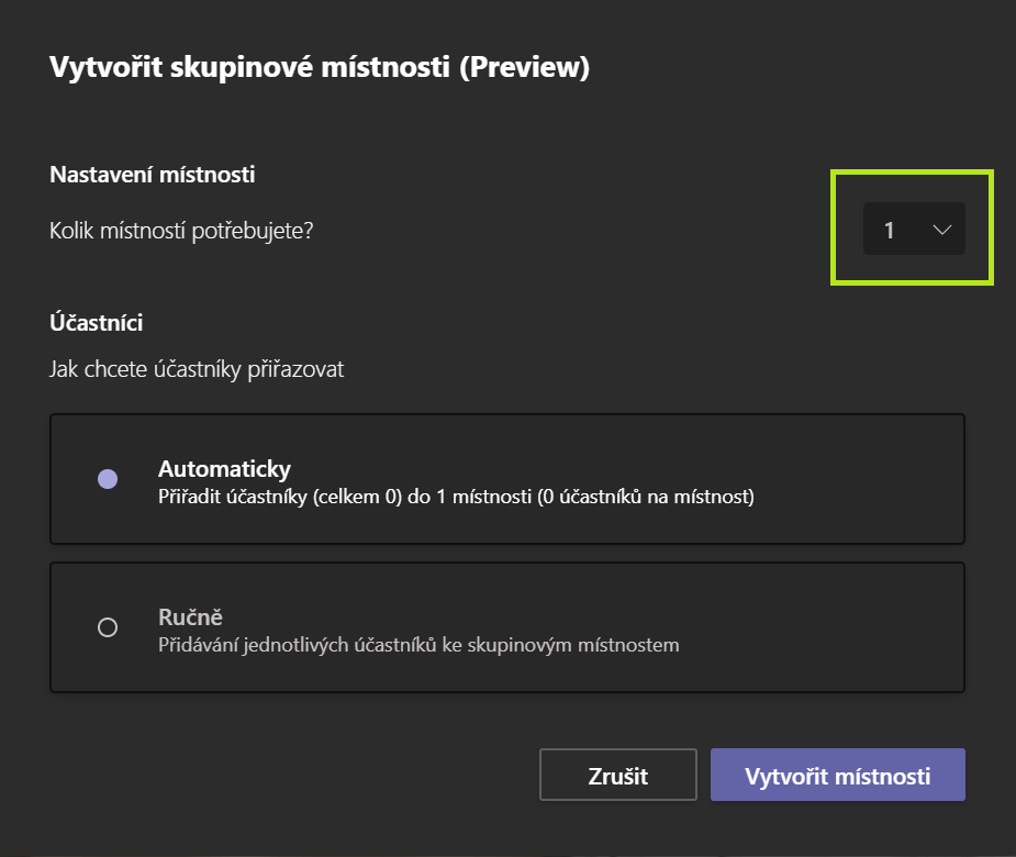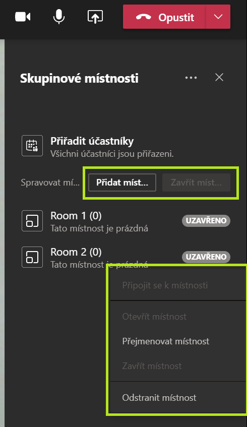 Po kliknutí na ikonu máme možnost nastavit si skupiny. Definujeme, kolik vedlejších hovorů chceme, a vybereme si, jestli Teams studenty rozdělí náhodně, nebo jestli studenty rozdělíme sami. S místnostmi pak můžeme dále pracovat na pravé straně obrazovky, kde se objeví panel s možnostmi. Vidíme zde seznam místností a jejich stav. "Uzavřeno" značí, že mezi místnostmi mohou procházet pouze volající se statusem prezentujícího. Místnosti můžeme také otevřít. Pokud myší najedeme na slovo "Uzavřeno", objeví se tři tečky. Tímto způsobem se můžeme připojit k místnosti, otevřít ji či uzavřít, přejmenovat ji nebo úplně odstranit. Naopak stav "Otevřeno" značí, že tuto místnost vidí všichni a že se k ní mohou kdykoli připojit dle libosti.