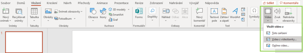 - V PowerPointu klikneme na kartu Vložení a poté ve skupině Multimédia na tlačítko Video