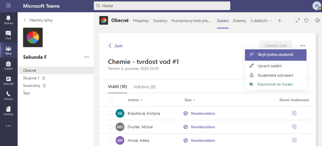 Ať už chceme, nebo ne, někdy opravování zadání sklouzne do subjektivního hodnocení podle toho, jestli jde o žáka s běžně vynikajícími výsledky, nebo žáka s podprůměrnými známkami. Aby se toto nestávalo, a nikomu tedy nebylo ani nadržováno, ani ubližováno, Teams přicházejí s možností opravovat zadání anonymně. Předtím, než učitelé začnou opravovat, si jednoduše skryjí jména a hodnotí všechny práce nejobjektivněji, jak to jen jde. V západních zemích je tento způsob zakrytí jmen běžný i u prezenčních testů. Jak na to? Učitelé tuto možnost najdou nad tabulkou odevzdání zadání pod třemi tečkami vpravo.