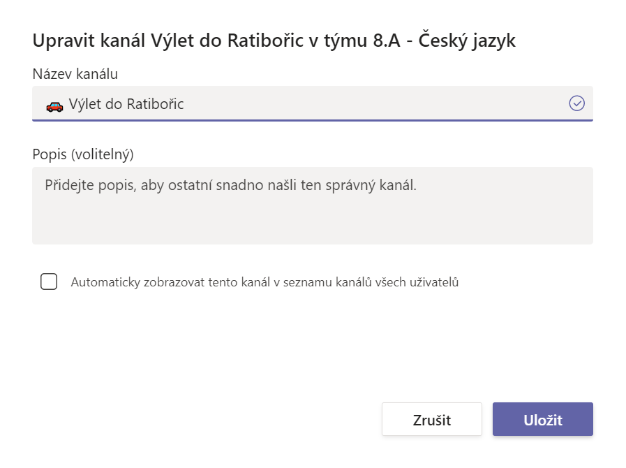 Nově je v Teams možné do názvu kanálu vložit ikonku, přesněji emojis. Ač se to může zdát jako malinkatá změna, v týmech, kde je hodně kanálů, se to může velice hodit pro větší přehlednost a lepší orientaci. Zároveň se tím usnadní používání Teams zejména pro mladší žáky, ale kdo říká, že těm starším se nějaké pěkné ikonky nebudou líbit. Emoji přidáme jednoduše, buď při vytváření nového kanálu kliknutím na tři tečky vedle názvu týmu a volbou Přidat kanál nebo při přejmenování stávajících kanálů kliknutím na tři tečky u daného kanálu a volbou Upravit tento kanál. Doporučujeme vložit emoji na začátek názvu.