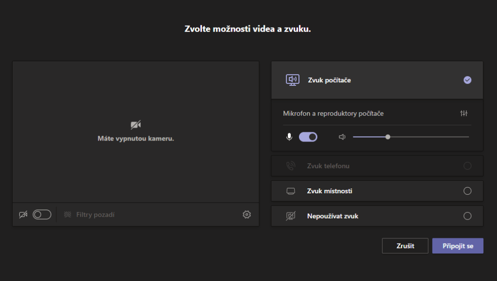 Znáte takovou tu obrazovku nastavení těsně před hovorem, kde si vybíráte zapnutí či vypnutí webkamery nebo mikrofonu? Toto nastavení bylo rozšířeno o další možnosti a prošlo kompletním redesignem. Náhled webkamery je větší, ihned jsou zde k dispozici i takzvané Filtry pozadí a pokud jde o zvuk, u něj máme na výběr z mnoha možností hodících se hlavně tehdy, když máme k zařízení připojeno více vstupních mikrofonů nebo výstupních reproduktorů nebo když využíváme konferenční sestavu. Přímo zde se také nachází nastavení hlasitosti. Používaná zařízení je ale možné změnit i dodatečně přímo při online hovoru.