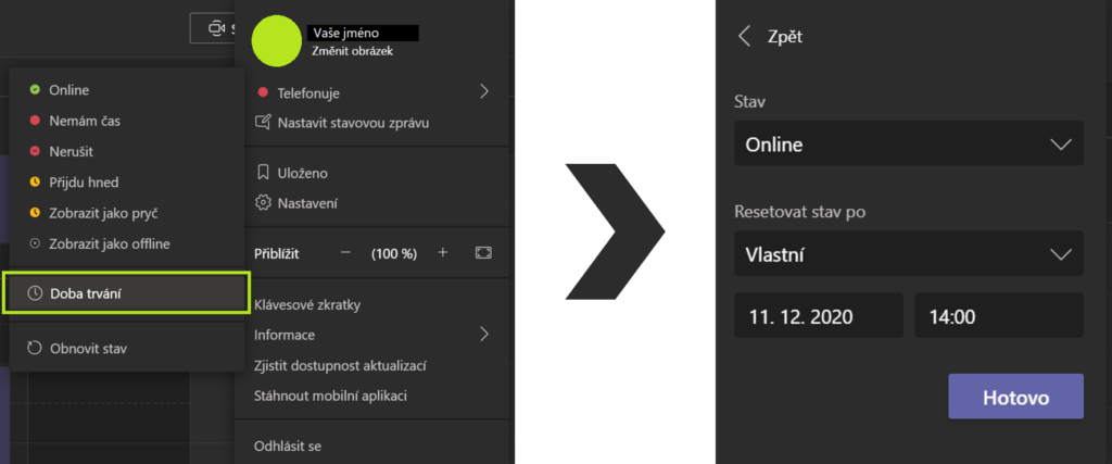 Do této chvíle bylo možné v Teams nastavit svůj stav ručně například na "Nemám čas", "Přijdu hned" nebo "Zobrazit jako pryč". Pomocí malé ikonky u fotky bylo možné poznat, jestli je člověk online, mimo kancelář nebo si třeba přeje být nerušen. Někdy by se ale hodilo, kdybychom nemuseli myslet na přepínání a mohli si dopředu nastavit, kdy se zobrazíme jako online nebo kdy už nám končí pracovní doba a chceme být mimo dosah a nerušeni. S novou aktualizací je toto možné, lze si nastavit dobu trvání určitého stavu. Klikneme na naši ikonu s iniciály či fotkou. Přímo pod naším jménem se nachází výběr aktuálního stavu. Pod stavovými možnostmi je nová volba Doba trvání s ikonou hodin. Nastavíme stav a za jak dlouho se sám resetuje.