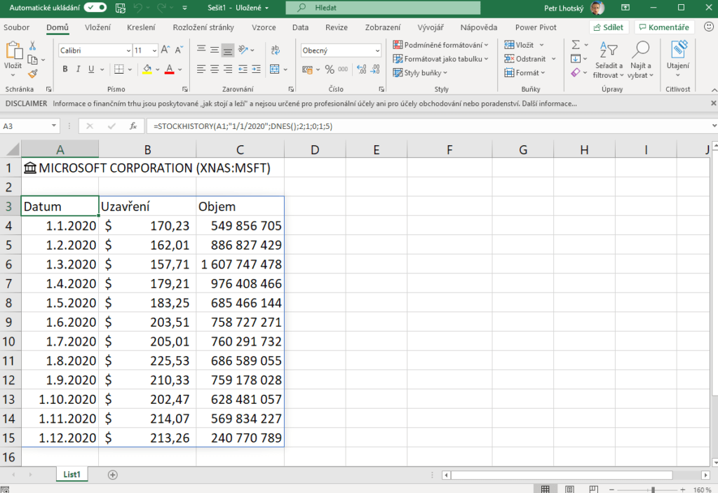 Na datové typy navazuje hned další novinka, a tou je funkce STOCKHISTORY. Umožňuje pomocí datového typu Akcie načíst informace o vývoji financí vybrané firmy, banky apod. Tento vývoj přepíše do matice, tedy do dvourozměrného pole, které si můžeme představit jako tabulku, takže není problém z automaticky získaných dat pak rychle vytvořit například graf. Funkci již můžete vyzkoušet i v české verzi Excelu. Další z mnoha příkladů, jak využít Excel k rychlé analýze dat. Nejjednodušší zápis je: