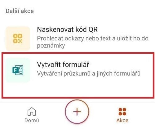 Do mobilní aplikace Office, o jejíž dalších funkcích se dočtete v článku Nová komplexní aplikace Office pro mobilní zařízení, byla přidána funkce, která nám dovoluje vytvářet, upravovat nebo kontrolovat formuláře služby Microsoft Forms. To znamená přístup k našim formulářům kdekoliv a kdykoliv. Funkci naleznete po kliknutí na tlačítko Akce pod možností Vytvořit formulář.