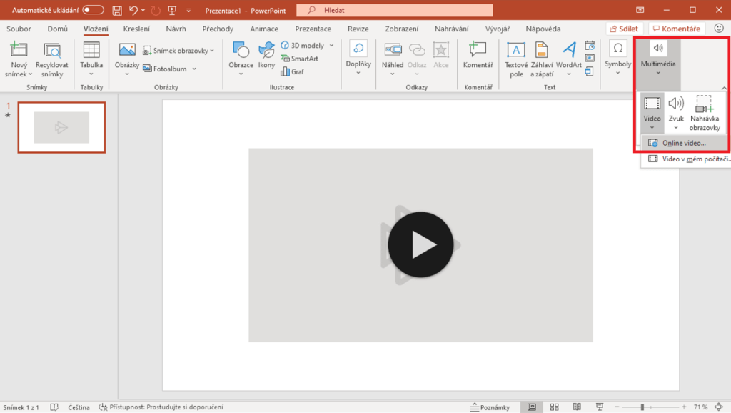 - Otevřete si prezentaci a přejděte na kartu Vložení, kde zvolte Video
