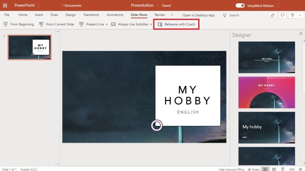- Otevřete si prezentaci a přejděte na kartu Slide Show, kde zvolte tlačítko Rehearse with Coach