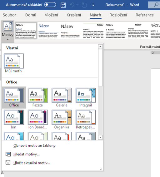 Na řadě je návrh dokumentu. Zatímco doteď jsme nastavovali spíše vlastnosti týkající se rozměrů a leckdo by řekl, že to byla ta nudnější část, tak teď už našemu dokumentu dodáme ten pravý barevný nádech. Začneme Motivy. To jsou již předpřipravené kombinace barev, písem a celkového rozložení, které spolu zkrátka dobře ladí. Najdeš je na kartě Návrh úplně vlevo. Je jich zde opravdu spousta a nutno dodat, že každý slouží k trochu jinému účelu. Je jen na tobě, do jaké barvy budeš chtít svou práci ladit.