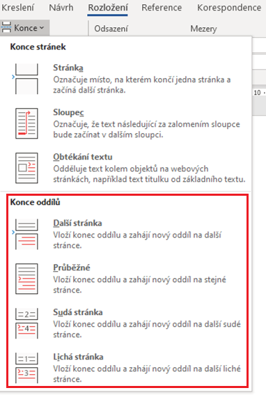 Kliknutím na šipečku u slova Konce vyjede tato nabídka. Oddíl vložíš tak, že nejprve klikneš za text, ze kterého chceš oddíl udělat, a až teprve poté vložíš pomocí této nabídky jeden z konců oddílu. Konec oddílu určuje, jakým způsobem se oddíl odlišuje od textu, který následuje, tedy třeba zda má být na nové stránce, či nikoli. Máme čtyři typy, které si nyní vysvětlíme: