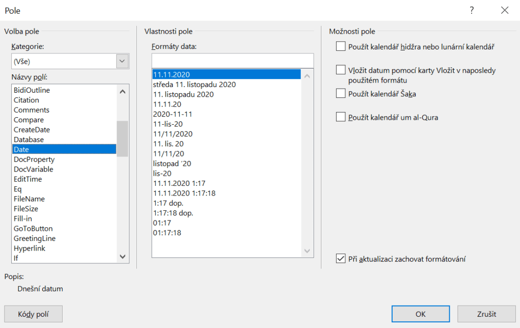 Na obrázku níže vidíme například pole pro datum, anglicky Date. V prostřední části okna si můžeš vybrat, v jakém formátu chceš, aby se datum zobrazovalo. Jakmile klikneš na OK, pole se vloží do dokumentu a zdánlivě vypadá jako text, ale pozor, nenech se zmást. Po kliknutí pravým tlačítkem myši na pole vyskočí možnost Aktualizovat pole. Kdybys tak učinil každý den, každý den by se text uvnitř pole obnovil. Aktualizaci všech polí doporučujeme pro jistotu udělat také úplně na konci práce.
