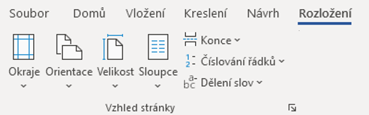 První z funkcí, které bychom měli nastavit, jsou ty související s rozložením stránek. Tedy jak se vlastně bude náš text na stránce chovat. Většinou ze školy dostaneš požadavky týkající se velikosti okrajů, rozložení textu na stránce, záhlaví a zápatí apod. A právě s tím ti pomůže ne tak známá skupina Vzhled stránky na kartě Rozložení. Pojďme se na ni teď zaměřit detailněji.