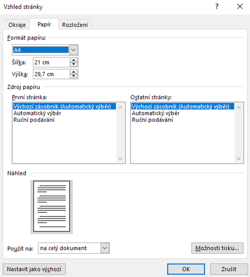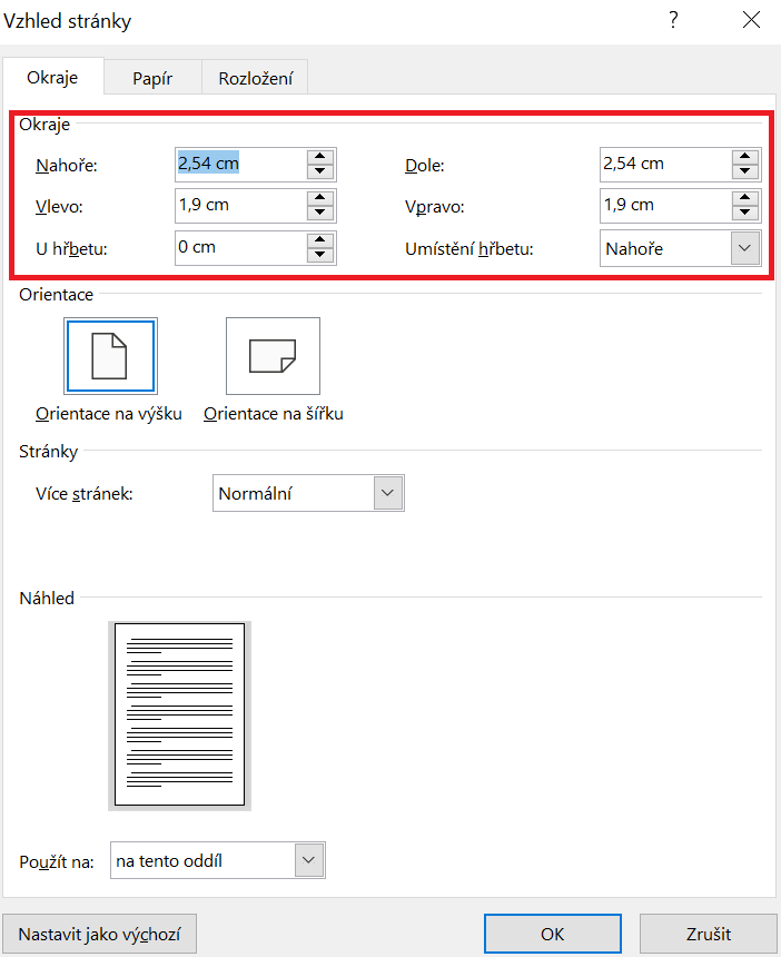 Když už jsme v tomto okně, tak hned pod okraji se nachází i Orientace. Stejnou nabídku ale najdeš i přímo na pásu karet. Jde o jednoduché nastavení pro polohu papíru, vertikálně nebo horizontálně. Dole pak ještě můžeš nastavit, jestli chceš, aby toto formátování platilo jen pro zvolený oddíl, nebo pro celý dokument. Vše potvrdíš tlačítkem OK. A vraťme se na pás karet.