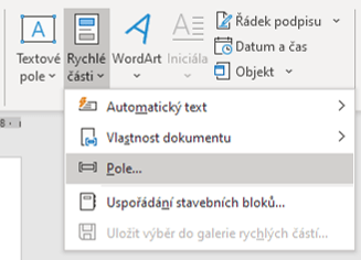 Pole bychom mohli označit za takovou třešničku na dortu. Jedná se o zástupný znak nebo jednoduše místo v dokumentu, které na první pohled vypadá jako obyčejný text, ale umí toho mnohem více. Pole uchovávají a zobrazují data, dokáží vykonat nějaký úplně jednoduchý úkol jako zobrazení aktuálního času nebo provedení jednoduchého výpočtu. V naší práci bychom je nejspíš použili na zobrazení jména autora a data, kdy byl náš dokument vytvořen, naposledy upraven nebo vytisknut. Zároveň bychom mohli do práce například zahnout interaktivní dotazník. Pole najdeš na kartě Vložit ve skupině Text. Nachází se tam hned několik ikonek. My budeme potřebovat nabídku Rychlé části, kde po rozkliknutí vybereme možnost Pole..., kterých je hned celá řada.