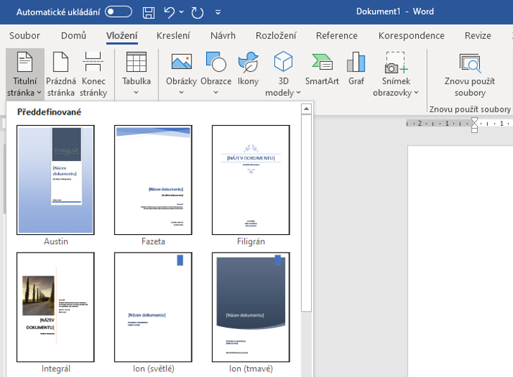 Možnost vložit titulní stránku se nachází na kartě Vložení pod nabídkou Titulní stránka, kterou najdeš úplně vlevo ve skupině Stránky. Na základě předtím vybraného motivu zde najdeš bohatý výběr s názvem Předdefinované. Když na jeden z náhledů klikneš, titulní stránka se vloží na začátek dokumentu a kromě designových prvků obsahuje i tzv. pole. O polích se dočteš níže.