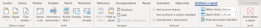 Vytvořením záhlaví se objeví další karta Záhlaví a zápatí, kde můžeme nastavit další vlastnosti jako vzdálenost od okraje, vložení obrázků do záhlaví nebo nastavení jiné podoby první stránky.