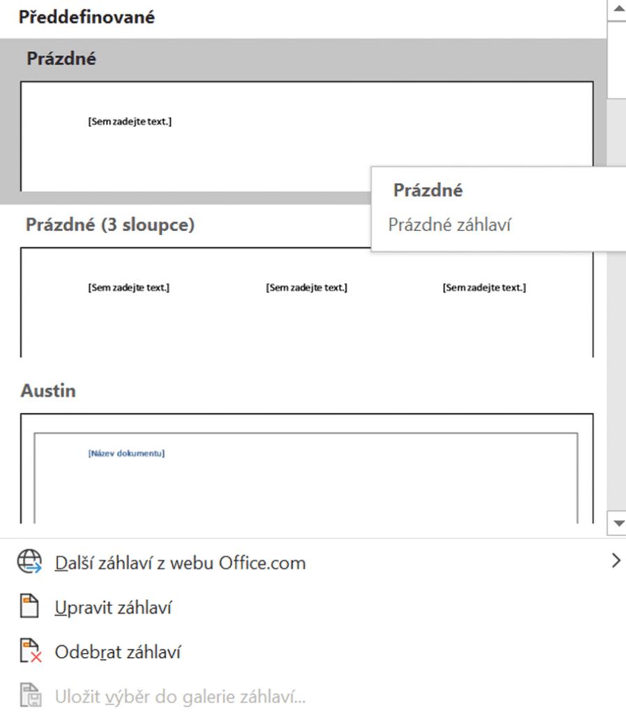 Poté stačí pouze kliknout na záhlaví/zápatí a vybrat si styl, který se nám líbí. Poté do záhlaví a zápatí můžeme napsat, co chceme – např. jméno autora, název práce.