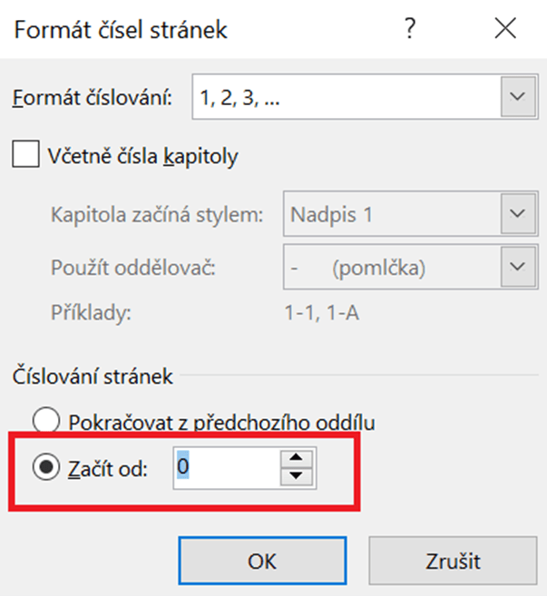Ze seznamu, který se objeví, přejdeme na Formát číslování stránek. Objeví se následující tabulka, ve které v dolní části zatrhneme Začít od: a hodnotu nastavíme na 0. Tohle nastavení dá první stránce číslo 0 a druhé stránce číslo 1. Takhle jsme to původně chtěli.