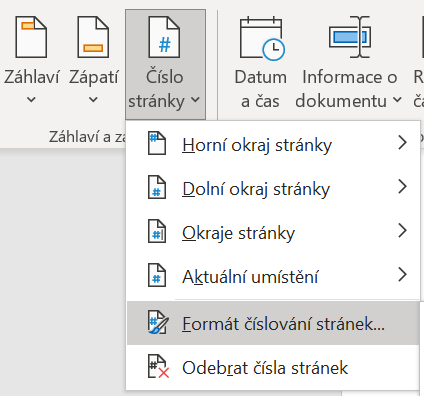 Pokud bychom chtěli, aby první stránka zůstala bez čísla, a až druhá strana měla číslo 1, není problém. Na nově vzniklé kartě Záhlaví a zápatí v levé části nabídky, vedle sekcí Záhlaví a zápatí vybereme číslo stránky a malou šipečkou rozklikneme nabídku.