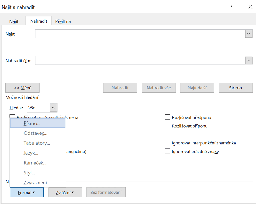 Níže si můžeme všimnout dvou tlačítek Formát a Zvláštní. Tyto dvě tlačítka nám umožňují ještě pokročilejší vyhledávání. Tak např. kliknutím na Formát -> Písmo se dostaneme do tabulky, kde si můžeme zvolit, aby nám Word vyhledal všechna slova napsaná kurzívou a předělal je na slova tučná.