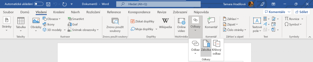 2. Klikneme na Vložení, vybereme možnost Odkazy a tam nalezneme ikonku Záložka.