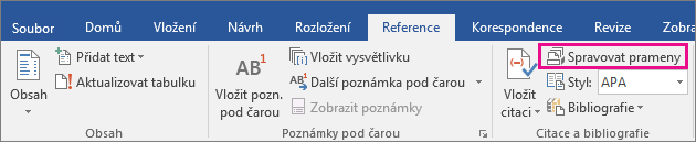 Na kartě Reference klikněte ve skupině Citace a bibliografie na Spravovat prameny.