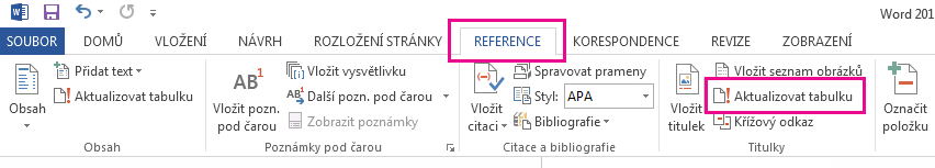 Pravým tlačítkem klikněte na seznam obrázků, a poté klikněte na Aktualizovat pole. Toto také můžete udělat na kartě Reference, kde klikněte na Aktualizovat tabulku. V dialogovém okně pak vyberte, co potřebujete upravit, a klikněte na OK.