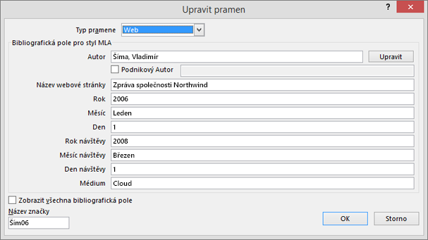 Poté klikněte na konec věty či fráze, kam chcete citaci vložit. Na kartě Reference klikněte na Vložit citaci. Chcete-li přidat informace o zdroji, klikněte na Přidat nový zdroj a potom v dialogovém okně Vytvořit zdroj klikněte na Typ zdroje a vyberte typ zdroje, který chcete použít (např. oddíl knihy nebo webové stránky). Chcete-li přidat zástupný symbol, abyste mohli vytvořit citaci a vyplnit informace o prameni později, klikněte na Přidat nový zástupný symbol. V okně Správce pramenů se vedle zástupného pramene zobrazí otazník. Pokud chcete přidat zdroj, zadejte podrobnosti o zdroji. Pokud chcete přidat další informace o prameni, zaškrtněte Zobrazit všechna bibliografická pole. Po dokončení klikněte na OK. Zdroj se přidá jako citace na vybrané místo.