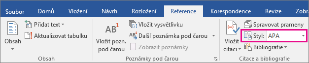 Rozklikněte kartu Reference, kde najdete Citace a bibliografie. Rozklikněte Styl a klikněte na styl, který chcete použít pro citaci. Například pro citaci v dokumentech zabývajících se společenskými vědami se obvykle používá styl MLA nebo APA.