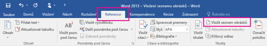 Klikněte v dokumentu na místo, kam chcete vložit seznam obrázků. Poté na kartě Reference klikněte na Vložit seznam obrázků. Můžete si vybrat z již připravených formátů nebo si v dialogovém okně vytvořit vlastní. Poté klikněte na OK.