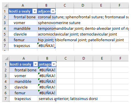Na příkladu pod tímto odstavcem je dvakrát ta stejná tabulky. Objekty v ní jsou pro tento experiment namíchané, prvních pět pojmů jsou kosti lidského těla, poslední je sval. U horní tabulky jsme chtěli zjistit sousední klouby, Excel správně vyhledal informace ke všem kostem. U spodní tabulky nás zajímaly antagonisté svalu, které Excel také našel. Zároveň se nenechal zmást tím, že tabulka obsahuje i kosti, které antagonisty nemají.
