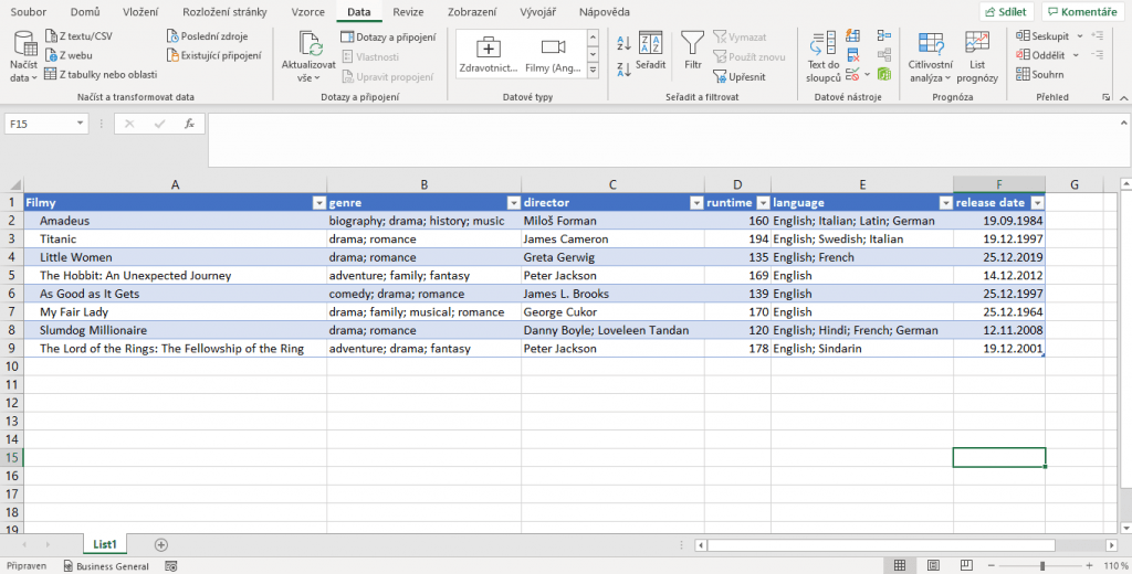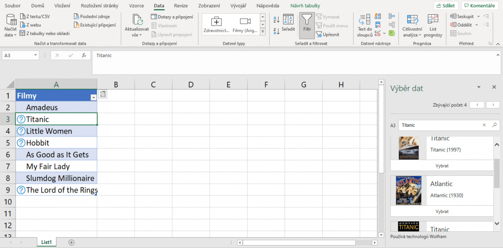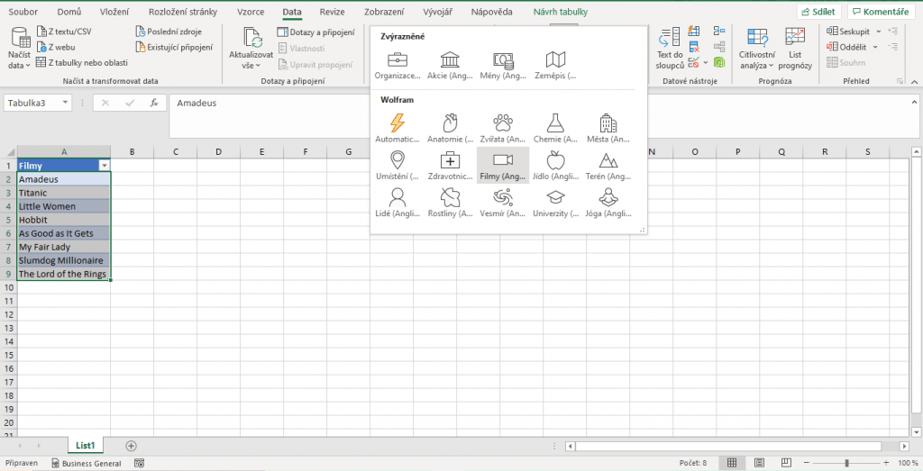 Vytvoříme si seznam pojmů v Excelu, o kterých chceme dohledat více informací. Většina datových typů je zatím dostupná pouze anglicky, proto tedy musíme zadat pojmy v angličtině. Tabulku označíme a na kartě Data v sekci Datové typy zvolíme oblast, která odpovídá našemu zadání, v našem příkladu zvolíme Filmy.