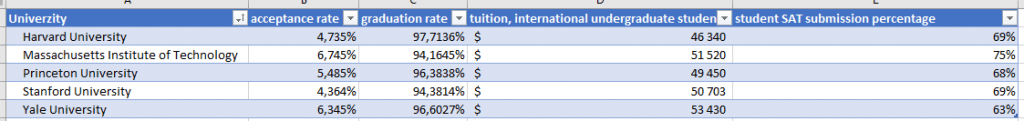 Datový typ Univerzity je bohužel zatím dostupný pouze pro americké vysoké školy. Po zadání jména univerzity si můžeme porovnat cenu jejich školného, procento přijatých, dále těch, kteří školu změní a nebo procento studentů na doktorandském studiu. K dispozici jsou navíc i informace o datu založení školy nebo o aktuálním počasí.