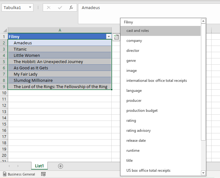 Ještě předtím, než dostaneme možnost vybírat, jaké informace chceme vyhledat, se může stát, že nás Excel požádá o upřesnění hledaných informací. Poznáme to tak, že se u řádku objeví malý modrý otazník. V našem případě se tak stalo, protože existuje více filmových adaptací na stejné téma. V nabídce napravo vybereme, kterou z možností jsme měli na mysli.