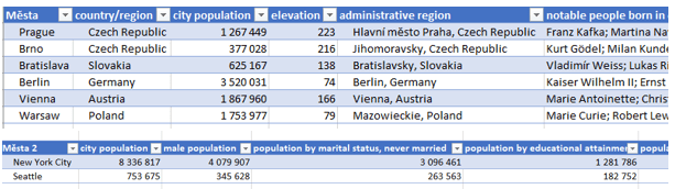 Na příkladu pod odstavcem můžeme vidět dvě tabulky, první se týká evropských měst a popisuje základní údaje, jako je třeba populace a nadmořská výška. Druhá tabulka o New Yorku a Seattle ukazuje zajímavé perličky, které jsou s touto funkcí dohledatelné.
