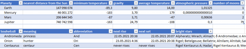 Datový typ Vesmír nabízí širokou paletu informací o hvězdách, planetách, kometách a mimozemských objektech. U planet můžeme porovnávat počet jejich měsíců, nejvyšší a nejnižší naměřené teploty, gravitační zrychlení či atmosférický tlak. U komet se dozvíme délku jejich dráhy nebo průměrné vzdálenosti od Slunce. Zájemci mohou vyhledávat a porovnávat informace o souhvězdích. Součástí datového typu Vesmír jsou i fakta o kosmických misích, raketách nebo Mezinárodní vesmírné stanici ISS.