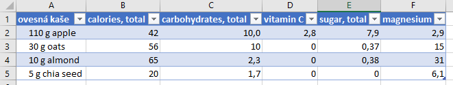 K výpočtu nutričních hodnot je tu datový typ Jídlo. Zjistí například počet kalorií, obsah makroživin, vitamínů nebo minerálních látek. Pokud zadáme samotnou potravinu, výsledné hodnoty se budou vztahovat na doporučenou porci, která je pomocí tohoto datového typu také zjistitelná. Do tabulky ale můžeme napsat i zvážené hodnoty, Excel poté ukáže čísla odpovídající zadanému množství jídla.
