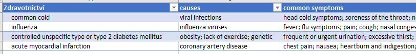Dalším praktickým datovým typem je Zdravotnictví. Když do Excelu zadáme název nemoci, můžeme získat informace o tom, co ji způsobuje, jaké jsou její příznaky, jak se léčí a nebo jak nemoci předejít. Zdravotnictví nabízí také informace o průměrném BMI pacientů určitých nemocí, jejich hmotnosti, výšce, nebo krevním tlaku. Kromě toho se můžeme dozvědět, do jaké kategorie nemoc spadá, jestli je nakažlivá a kde na světě je nejrozšířenější.