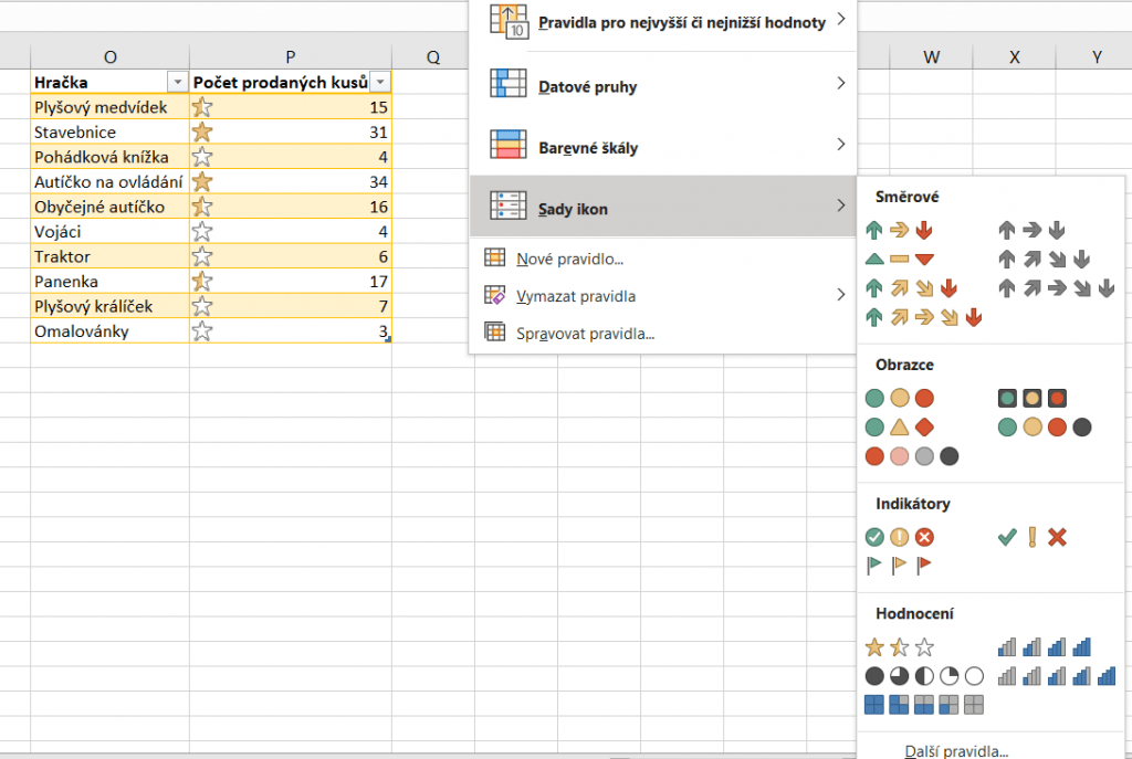 Tato funkce nám pomůže graficky rozdělit hodnoty tím, že přidá stejnou ikonu velikostně podobným číslům. Jako příklad máme na obrázku tabulku, na kterou byla použita sada ikon tvaru hvězdy. Čím větší část hvězdy je vybarvená, tím větší je v tabulce hodnota, ke které hvězda patří. V rozšířeném zadání, ke kterému se dostaneme při kliknutí na Další pravidla..., můžeme také prohodit pořadí ikon, navrhnout si jejich vlastní kombinaci nebo nastavit vlastní pravidla, podle kterých se ikony nastaví.