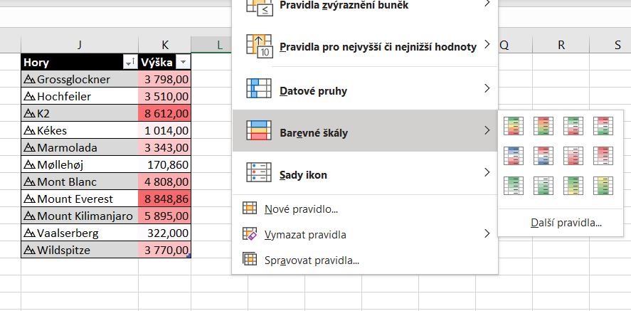 Barevné škály nám pomohou vizuálně rozdělit hodnoty podle velikosti. Tato funkce funguje podobně jako barevné rozdíly terénu na mapách. Na výběr máme z dvanácti základních typů, ale kliknutím na Další pravidla... můžeme snadno nastavit vlastní parametry, jako jsou třeba požadované barvy nebo hodnoty, na kterých chceme již mít použitou určitou barvu.