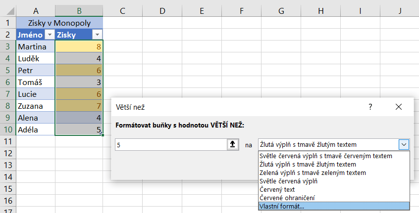 První možností v seznamu jsou Pravidla zvýraznění buněk. Po najetí myší na termín se napravo rozbalí další nabídka s možnostmi, jako jsou například Větší než..., Rovná se..., Text, který obsahuje..., nebo Duplicitní hodnoty... Všechny fungují na stejném principu. Po kliknutí se zobrazí okno, které po nás bude chtít nastavit pravidla. Například funkce Větší než... zvýrazní všechny hodnoty, které budou vyšší než nastavené číslo. V okně musíme tedy nastavit dvě věci - zaprvé zadat číslo, které bude udávat spodní hranici podmínky (zvýrazněné hodnoty budou větší než zadané číslo) a způsob, jakým tato čísla zvýrazníme. Nejčastěji se jedná o barevnou výplň, ale při zvolení možnosti Vlastní formát... v rozbalovací nabídce můžeme nastavit například také libovolný font, zvýraznění písma nebo ohraničení.