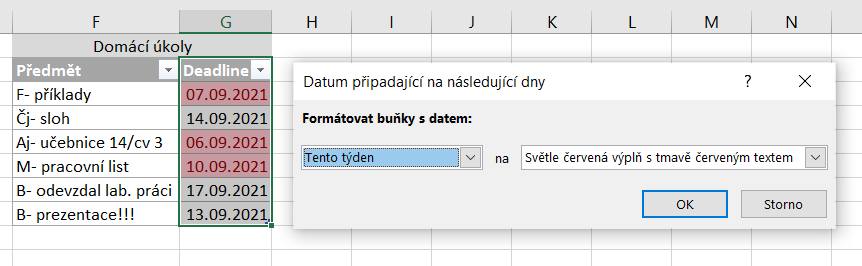 Pokud chceme protřídit tabulku obsahující časové údaje, můžeme použít funkci Datum připadající na následující dny... V našem případě jsme zvolili možnost Tento týden a barevně se zvýraznily buňky, které obsahují datum současného týdne. Tak si můžeme například jednoduše pohlídat důležité termíny, které nechceme nebo nemůžeme zmeškat.