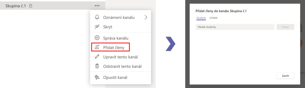 Žáky do kanálu přidáme až během začátku hodiny, kdy si spolu všichni zavoláte jako obvykle přes váš kmenový tým a schůzku naplánovanou v kalendáři. Přidáváme je až v tento moment, protože kdyby byli přidáni dříve, už by o soukromém kanálu věděli a mohli by například začít dříve. Uděláme to tak, že vedle názvu kanálu klikneme na tři tečky a vybereme možnost Přidat členy.